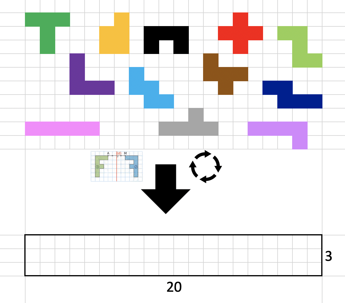 2 Disposer les douze pentominos (5x12) obtenus sur un rectangle de 3x20